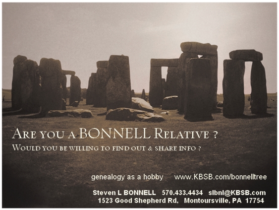 Initial ON-Line Date: 09 Sep 97 This is a project started to re-unite as many members of the BONNELL Family Tree as possible. I will be providing more information and details as they become available and my time permits.
